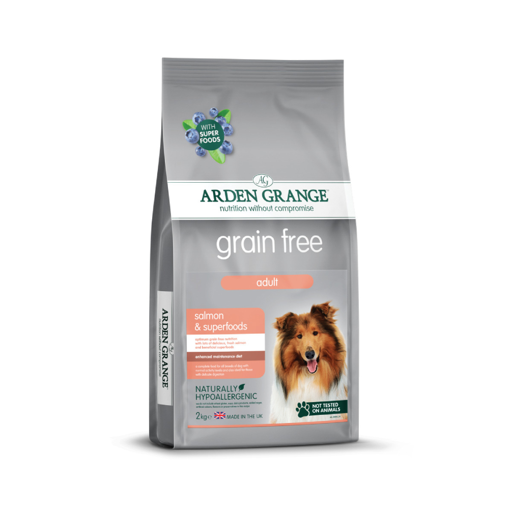 The Arden Grange Grain Free Adult Salmon Dog Dry Food is a complete, super-premium pet food for normally active adult dogs. It contains 43% salmon as the primary source of protein and may be of particular benefit to skin and coat.