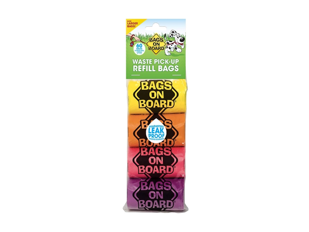 Bags on Board Dog Waste Pick up Refill Bags make picking up dog poop and pet waste quick, easy and simple whether on a walk or in the backyard. Our bags have double sealed seams to make them stronger and leak proof guaranteed. Bob Refill Poop Bag.