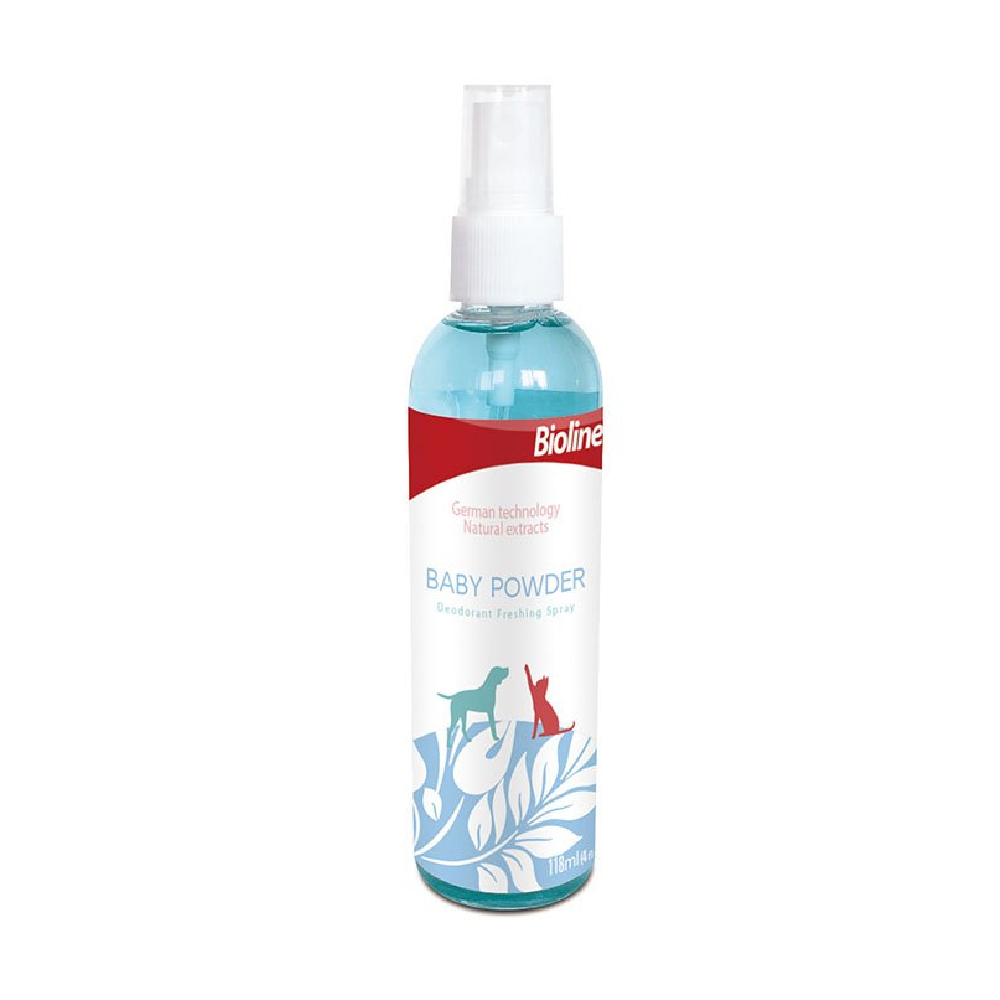 Bioline Baby Powder Deodorizing Spray swiftly eliminates bad smells caused by your pet's body odor, providing a pleasant and lasting fragrance. This 118 ml deodorizing spray is formulated with German technology and natural extracts to ensure effective odor control.