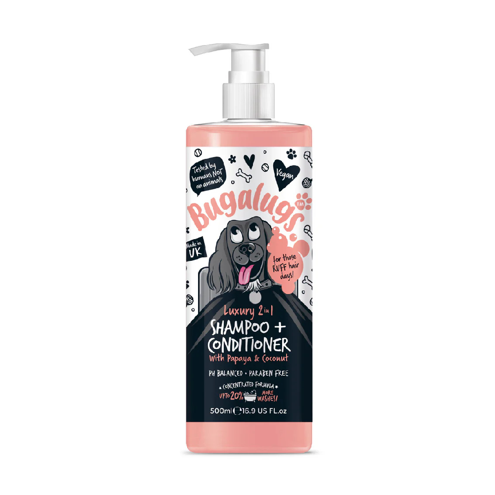 Our Luxury 2 in 1 Dog Shampoo and Conditioner is no different. Packed with papaya and coconut that leaves the coat with a long-lasting and irresistible tropical fragrance, our Bugalugs 2 in 1 ensures your dog has luxurious lather at bath time every time.