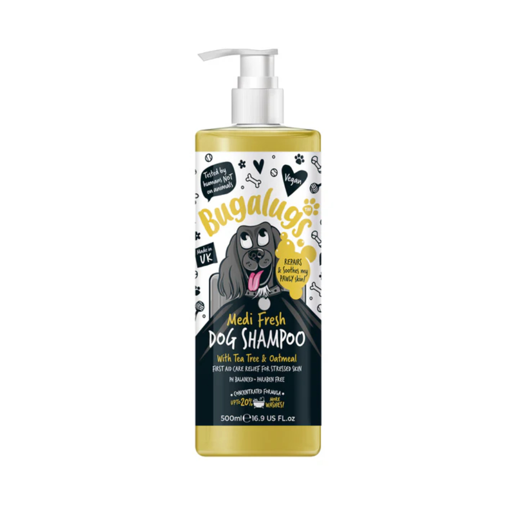 If your dog is suffering with itchy, ‘pawly’ skin, dry skin, doggy dandruff or worse… has recently suffered unwanted visitors in their coat… then the Bugalugs Medi Fresh itchy skin dog shampoo is what you’ve been looking for.