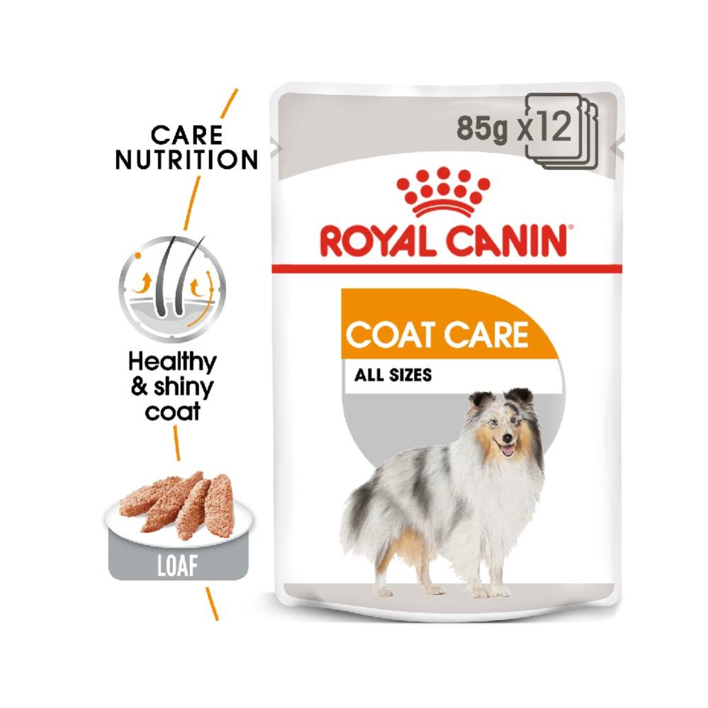 A good reflection of your dog’s well-being is his coat condition. A rich and silky coat is a sign of effective nourishment. ROYAL CANIN® Coat Care Loaf’s smart formula feeds your dog’s skin and coat from the inside, meaning your dog will not only look better but feel great too. This food is enriched with fatty acids Omega 3 and 6, as well as GLA-rich Borage Oil. These nutrients help to nourish your dog’s skin and coat. What’s more, melanin precursors tyrosine and phenylalanine are also included in ROYAL CANIN® Coat Care Loaf’s exclusive formula; these nutrients work to intensify your dog’s coat colour. ROYAL CANIN® Coat Care Loaf is suitable for dogs of all sizes with dull and rough hair. Decades of advanced scientific research into canine nutrition are at your service in this food that feeds your dog’s coat too! In addition to this delicious pâté, our Coat Care nutritional program is also available as crunchy kibble. Both are nutritionally complete and perfectly complement each other. Why not try the pâté as a delicious topping to the kibble?