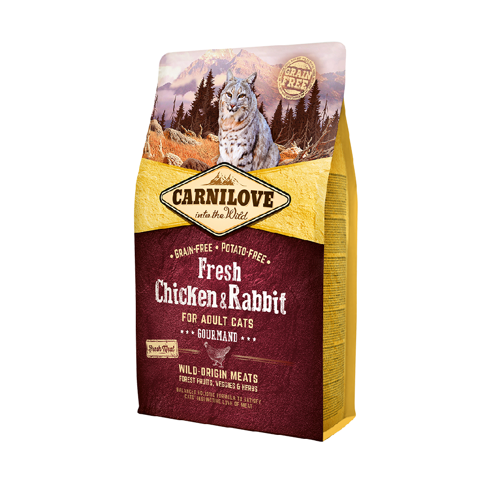 Unique and independent creatures, cats are meat eaters, full-blooded predators whose way of life is determined by a strong hunting instinct. Carnilove Fresh Chicken & Rabbit has been formulated with respect for the laws of nature and provides your feline companion with balanced nutrition rich in fresh meat combined with a variety of vegetables, berries and herbs. Returning to a natural diet supports healthy digestion and helps maintain optimal physical condition. Bursting with flavor, the top-quality natural ingredients are irresistible to even the choosiest of feline gourmands.
