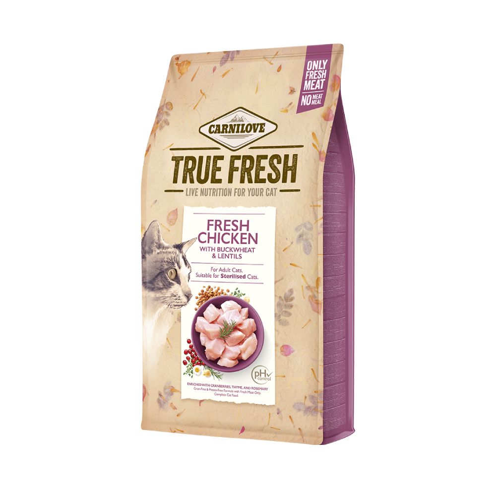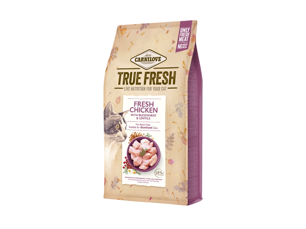 The formula contains a high proportion of fresh turkey from farms and local sources. The unique production method preserves the original properties of the ingredients for an entirely new and delicious sensory experience that satisfies cats’ natural instincts. Because the meat is processed fresh, true fresh provides excellent taste, digestibility, and a more natural form of nutrition. Buckwheat, peas, and lentils are natural sources of vegetable protein and the minerals required for healthy metabolism, and they help maintain optimum body weight. Peas and red lentils are excellent sources of dietary fibre and have a low glycaemic index, which means blood sugar increases slowly after a meal. -Fresh chicken – an excellent source of amino acids with limited amount of fat – great for building muscles and promoting strong immunity -Cranberries, sea buckthorn, and blueberries help to keep optimal urinary pH and healthy urinary tract -Antioxidants in cranberries, sea buckthorn, blueberries, and lemna improve various immune functions and help to protect the body from infections.
