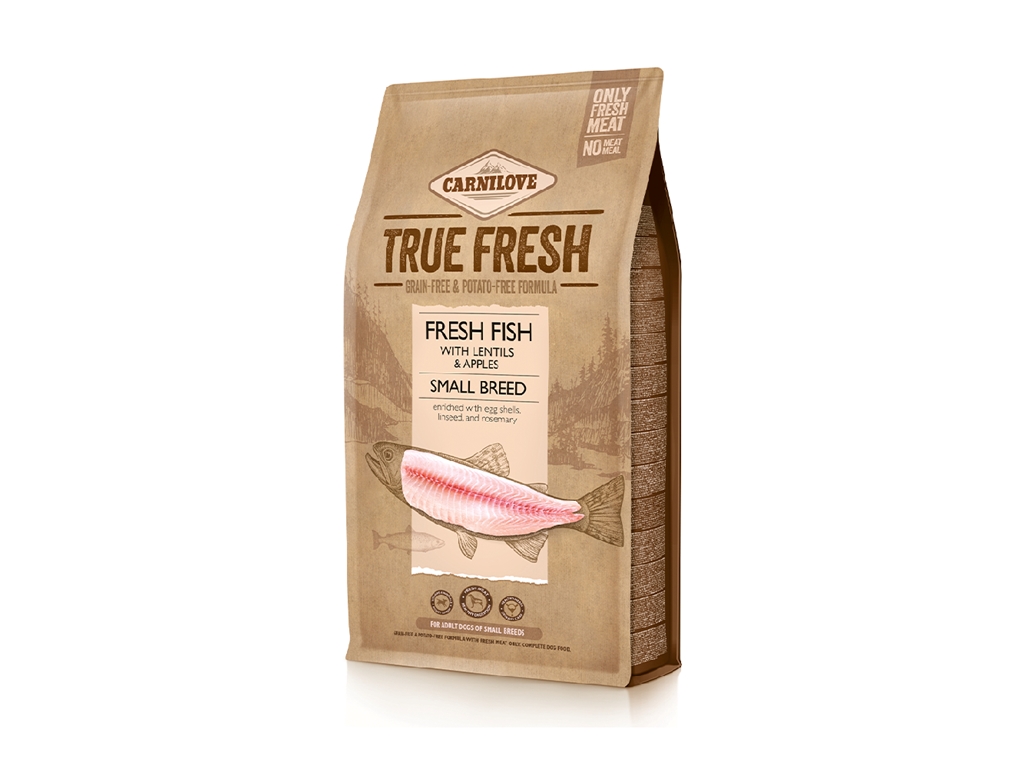 The formula is balanced according to the nutritional needs of small dogs, providing healthy fuel to keep their energy levels up. It contains a high proportion of fresh fish, an excellent source of B vitamins that help small dogs stay calm in stressful situations. Egg shells and green-lipped mussels contain minerals that play an important role in bone mineralization and the formation of strong bones, joints and teeth, while vitamins C and E support immune system health. Chickpeas and lentils are a natural source of vegetable protein and minerals required for healthy metabolism. Pumpkin and apples are a high-quality source of fibre, which supports digestive tract health and ensures efficient absorption of essential nutrients. It also helps maintain optimum body weight.