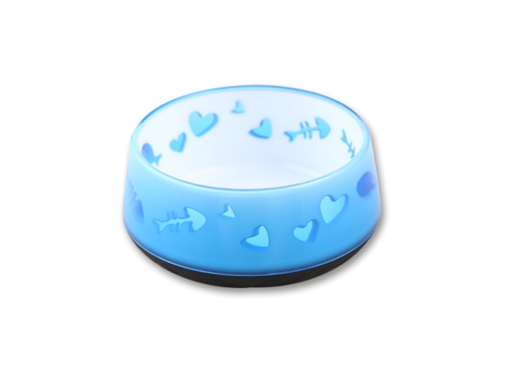 This blue unique cat love bowl is perfect for feeding or providing feline fresh water. It features fish and love cut out alongside the outer edges, providing a small tough of style. With the bright color, the cat will love it.
