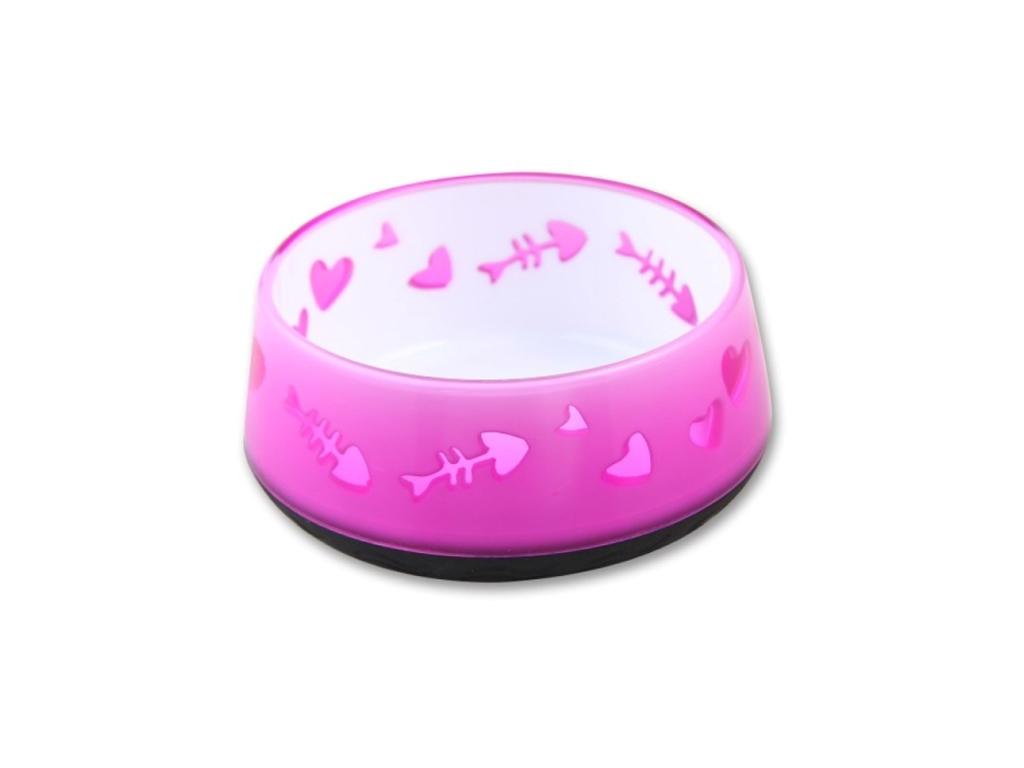 This pink unique cat love bowl is perfect for feeding or providing feline fresh water. It features fish and love cut out alongside the outer edges, providing a small tough of style. With the bright color, the cat will love it.