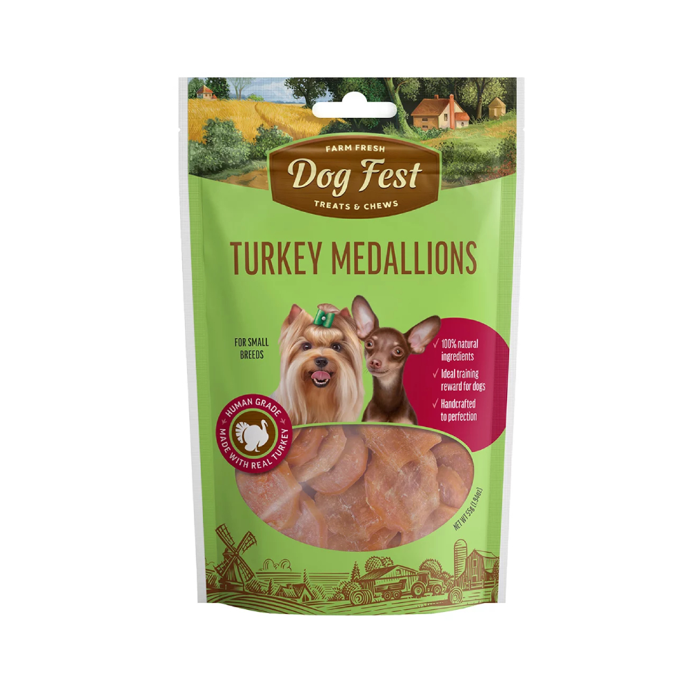 Dog Fest Turkey Medallions For Small Breeds Delicious, tender turkey medallion is a perfect reward. Known for being very gentle on a dog’s stomach, this is a type of treat you should always have with you when you are out with your furry friend.