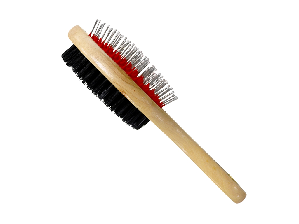 This pleasing and curvaceously shaped double sided pet grooming brush, fits snuggly in your hand. It features two unique sides; a supple rubber pad, housing a bed of round ended metal pins and a nylon bristled side. The rubber pad allows the pins to flex and move through your pet’s hair, de-matting your pet’s coat and leaving it tangle free. Whereas the nylon bristled side is much softer, giving a smooth and silky coat.