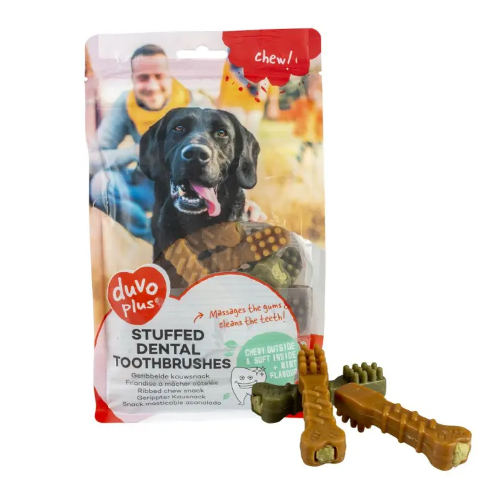Give your dog a tasty treat that promotes oral health with Duvoplus Chew! Stuffed Dental Toothbrushes. These fun snacks are designed to make your pup's dental care enjoyable while satisfying their chewing instincts.