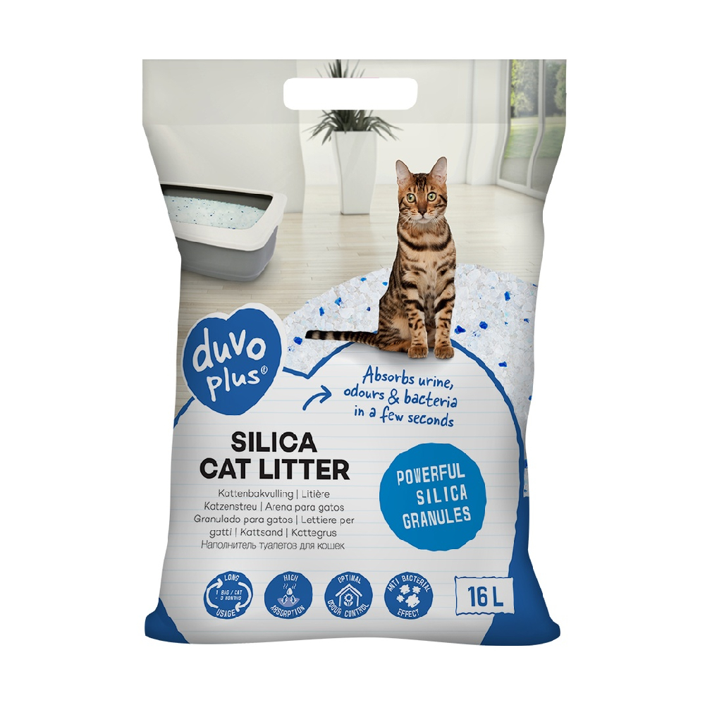 The duvoplus Silica is a user-friendly, light cat litter made of silica gel. The granules ensure that the urine is immediately absorbed, so that the content of the litter box always feels dry. Silica guarantees a high absorption capacity and optimal odour control. Urine and odours are neutralised in a few seconds and bacteria are entrapped inside the silica. Moreover, the granules are (extra) fine and soft so they feel very gentle to the sensitive paws of your cat. This safe, long-lasting and dust-free cat litter is ideal for cats and people with allergies.