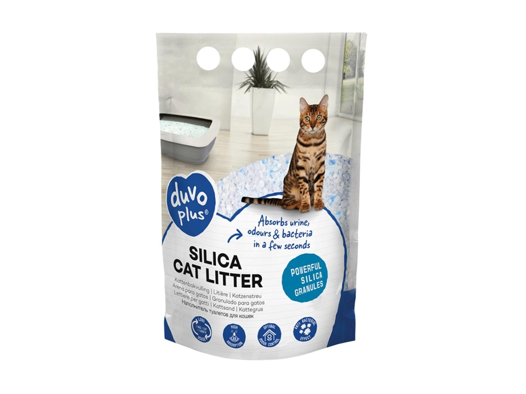 The duvoplus Silica is a user-friendly, light cat litter made of silica gel. The granules ensure that the urine is immediately absorbed, so that the content of the litter box always feels dry. Silica guarantees a high absorption capacity and optimal odour control. Urine and odours are neutralised in a few seconds and bacteria are entrapped inside the silica. Moreover, the granules are (extra) fine and soft so they feel very gentle to the sensitive paws of your cat. This safe, long-lasting and dust-free cat litter is ideal for cats and people with allergies.