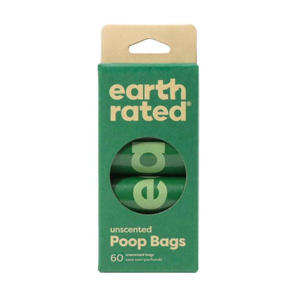These unscented Earth Rated refill rolls (60 bags) deliver extra-long, extra-strong bags with 100% leak-proof construction, made from 65% certified post-consumer recycled plastic — a compact and convenient solution for dog owners on the go.