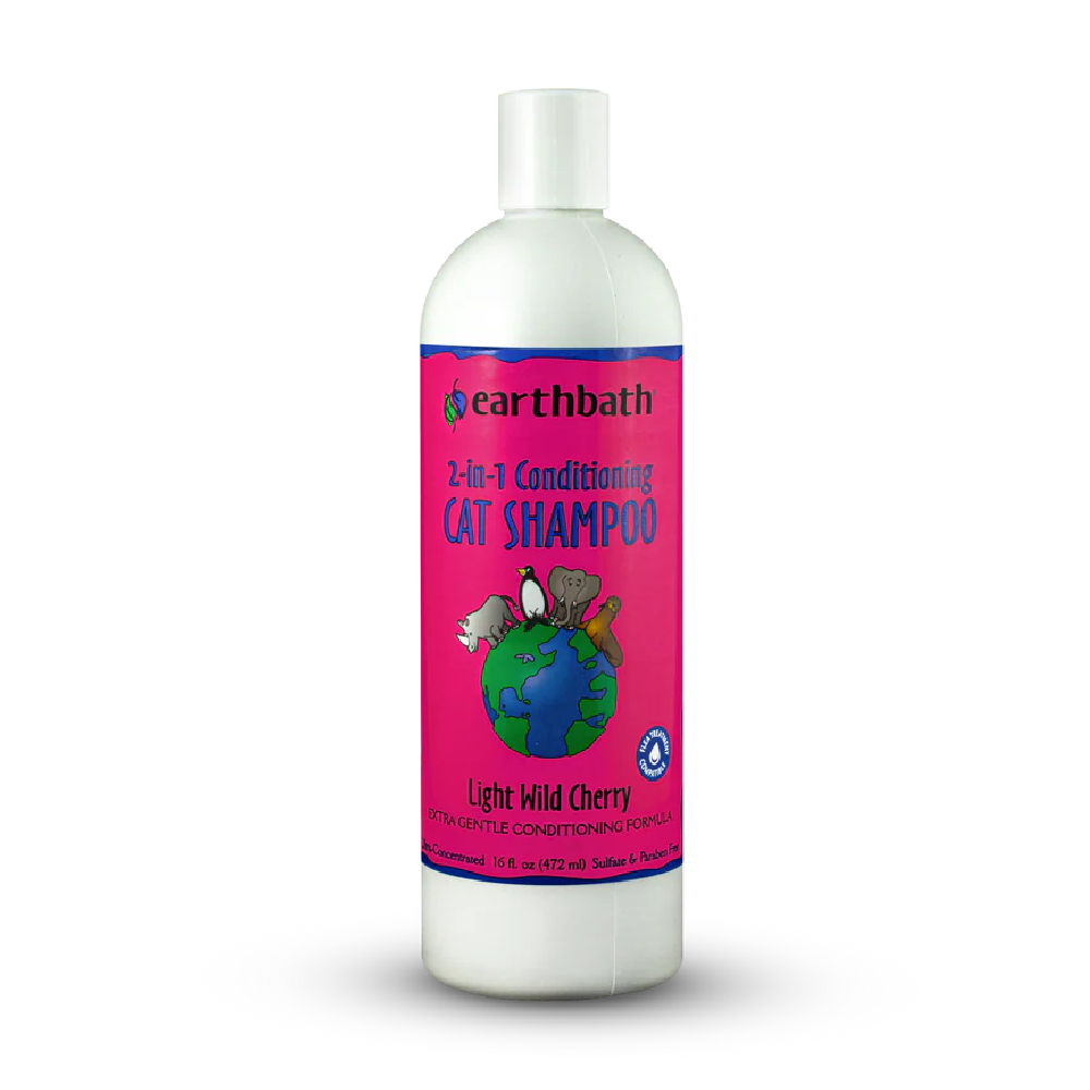 Formulated this extra gentle, pH-balanced, 2-in-1 conditioning shampoo for our finest furred feline friends. Gentle conditioners and organic aloe vera soften the coat, re-moisturize the skin, and add manageability, brilliance, and shine. Our ultra-mild coconut-based cleansers and the subtle scent of wild cherries will leave her smelling fresh and deliciously clean. Will not wash off topical flea applications. Safe for all animals over 6 weeks old. To encourage peaceful co-existence in multi-cat households, use our Fragrance Free Hypo-Allergenic Cat Shampoo.