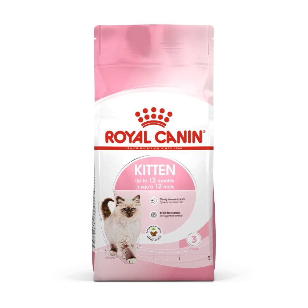 ROYAL CANIN Kitten is specially formulated to support the nutritional needs of kittens in the "consolidation phase" of their growth. This formula is suitable for 4 to 12-month-old kittens as they undergo a period of significant physical and behavioural changes. This tailored diet contains adapted levels of protein, minerals, and vitamins to help satisfy your kitten's rising energy levels and support growing bones and muscles. It also contains nutrients such as Vitamin C and E to support the development of the kitten's healthy immune system. These dietary antioxidants have been shown to stimulate a higher and faster rise in antibodies after vaccination. ROYAL CANIN Kitten is also enriched with Omega-3 fatty acids (DHA) to support brain development and promote healthy vision. Thanks to a combination of beneficial prebiotics (MOS) and highly digestible proteins, ROYAL CANIN Kitten also helps to support a healthy balance of intestinal microbiota (gut flora) for good digestion. The kibble in ROYAL CANIN Kitten has also been specially designed for your kitten's tiny mouth. A mechanical brushing effect as your kitten chews helps to support dental health. By the time your kitten reaches 12 months old, they will need a diet that's specially adapted to meet their nutritional needs as a grown cat. At this stage, you can transition them onto the ROYAL CANIN range of diets for adult cats, available as dry kibble or wet food in loaf, gravy or jelly.