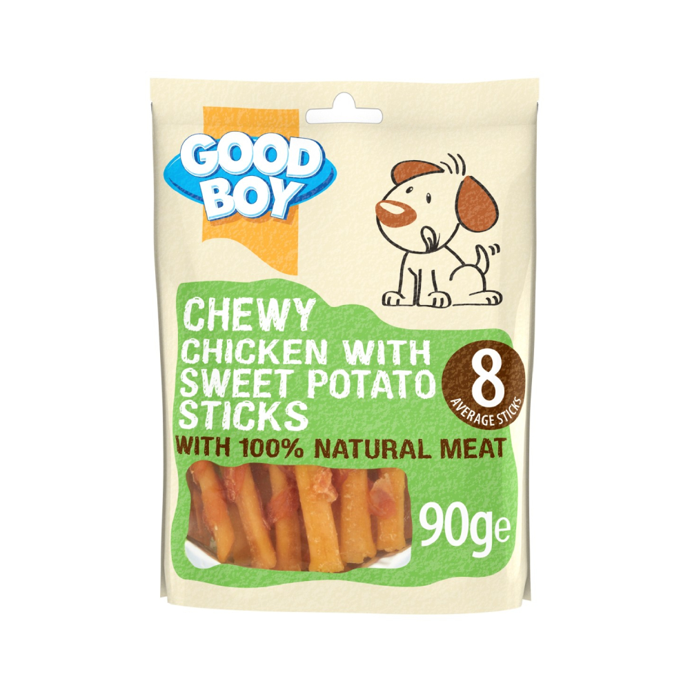 This Chewy Chicken with Sweet Potato Sticks are made with super duper tasty 100% natural chicken breast meat so are sure to become one of your dog’s favourite treats. Lovingly packed in a handy, re-sealable bag, as well as being lip-smackingly tasty they are full of natural goodness too as they are: