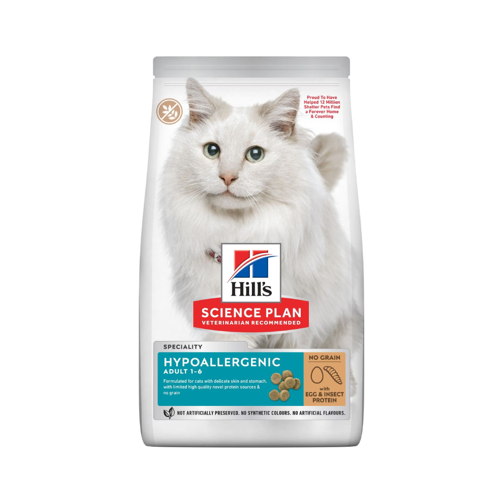 Hill’s SCIENCE PLAN Hypoallergenic adult cat food with egg & insect protein it is a gentle recipe formulated with limited high quality novel protein sources & no grain tailored to meet the needs of cats with sensitivities.
