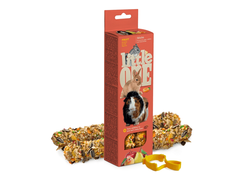 Little One Sticks with fruit are supplementary treats designed specifically for guinea pigs, rabbits, and chinchillas. Each pack contains two 60g sticks, providing a total of 120g of treat. These sticks are enriched with dried fruits, offering a tasty and engaging way for these small animals to get essential vitamins and minerals, while also providing a natural chewing activity.