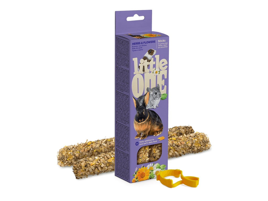 Little One Sticks with Herbs and Flowers are supplementary treats specifically formulated for guinea pigs, rabbits, degus, and chinchillas. Each pack contains two 55g sticks, providing a total of 110g of treat. These sticks are enriched with a blend of natural herbs and flowers, offering a fragrant and engaging snack that provides additional natural nutrients and promotes essential gnawing behavior for dental health.