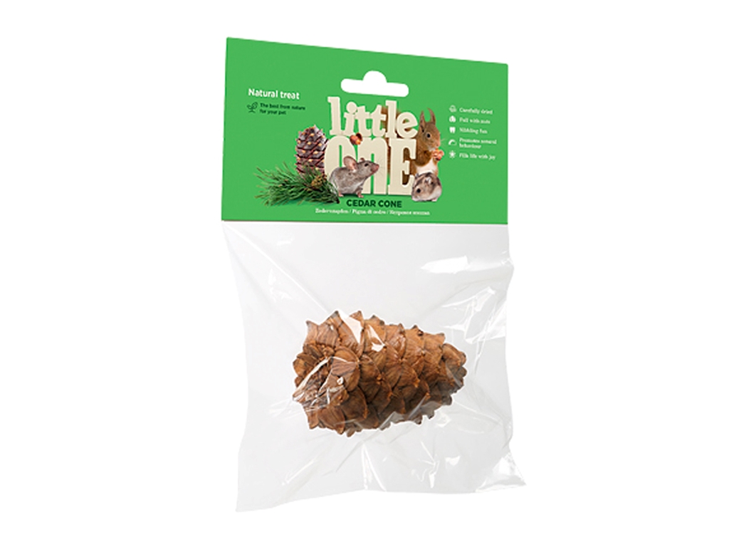 Little One “Cedar cone” is a great toy for home pets. While crunching forest cones, the animals grind down their teeth and get beneficial nutrients contained in the nuts. The pignolia nut is rich in antioxidants, vitamins and minerals. We use a special technique for drying Little One cones, that’s why tar content is significantly reduced.