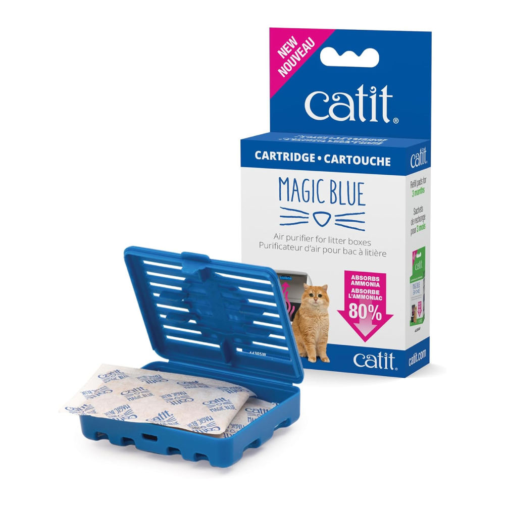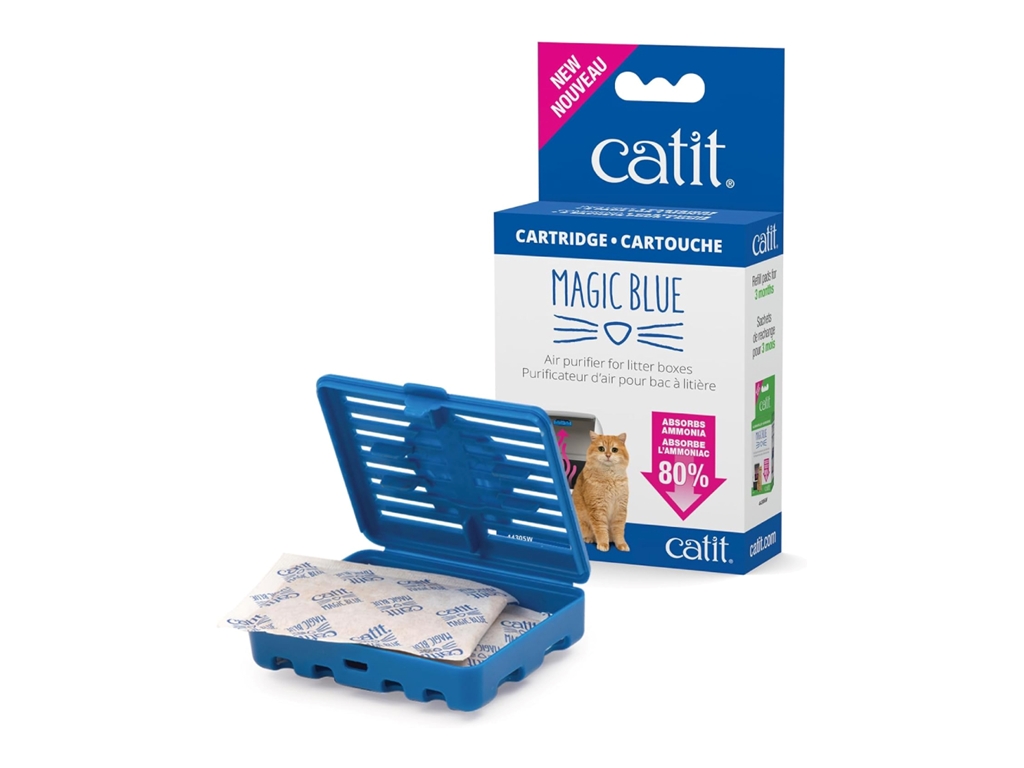 The Hagen Magic Blue Air purifier is a non-toxic litter box filter that absorbs and retains up to 80% of ammonia and reduces fecal odors by an average of 40%, depending on your cat's diet.