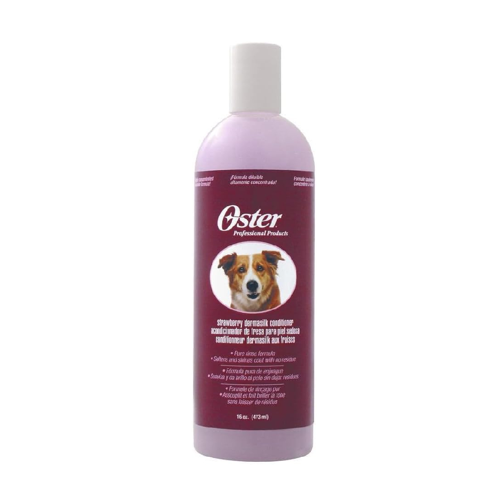 Oster silky shine strawberry conditioner gives coats a fresh shine with no greasy residue, specially developed to moisturise and revitalise, makes coats softer and easier to comb, delightful strawberry fragrance.