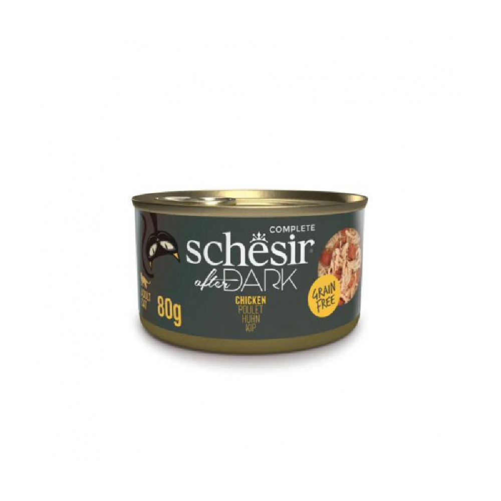 Schesir After Dark is the range of minimally processed, complete and balanced wet foods with a high protein content, for cats who love the taste of meat and innards. A high protein content with real chicken fillets in broth, together with tasty and nourishing chunks of heart, liver and gizzards.