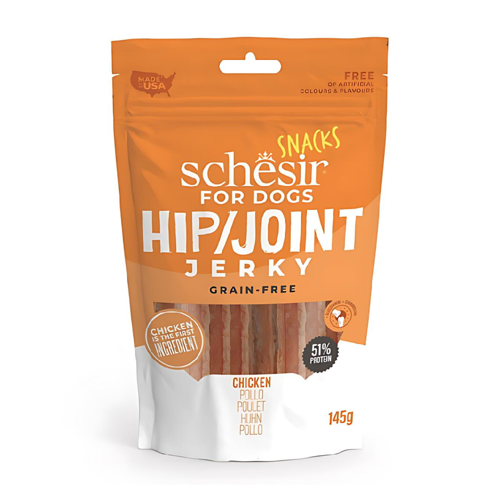 Schesir Dog Snacks - Jerky, Hip&Joint . Chicken is the first ingredient. Grain Free. With Glucosamine & Chondroitin, Free of Artificial Colours & Flavours.