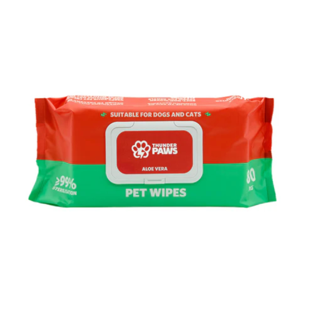 Thunder Paws Aloe Vera Sanitary Pet Wipes are made to keep your pet’s coat fresh and clean by helping to remove dust, excess hair, and dirt. This sanitary pet wipes is suitable for cats and dogs with an aloe vera scent. Pet Wipes are specially crafted for both cats and dogs, offering a gentle and effective solution for maintaining your pet's hygiene. Enriched with the soothing properties of aloe vera, these wipes provide a calming and moisturizing effect while cleaning your pet's coat and skin. Perfect for various cleaning tasks, such as wiping paws, cleaning around the face and ears, or freshening up between baths, these wipes are versatile and convenient for everyday use. The soft and durable material ensures they are gentle on your pet's skin, while effectively removing dirt, dander, and odor. Keep your pet feeling clean, refreshed, and pampered with Thunder Paws Aloe Vera Sanitary Pet Wipes.