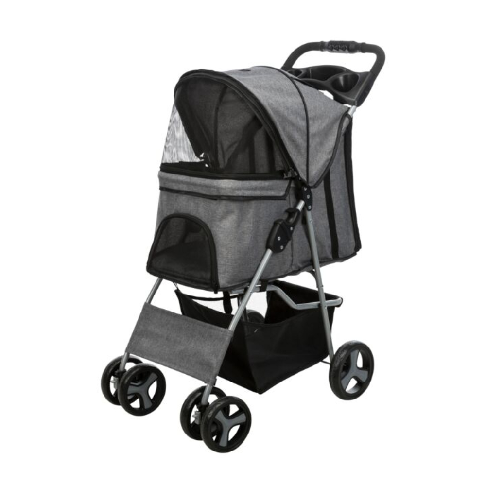 The Trixie buggy stroller is designed for both dogs and cats, measuring 80×47×100 cm. It features a durable frame, mesh windows for ventilation, and smooth wheels for easy maneuvering. The enclosed compartment keeps pets safe while providing a comfortable ride. Ideal for walks, vet visits, or outdoor adventures.