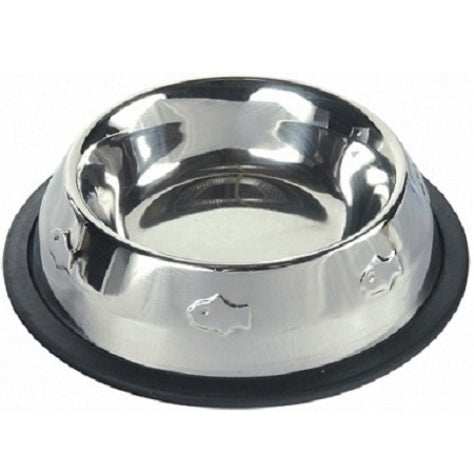 A popular quality stainless steel bowl embossed with fish shape. This is easy to clean and will withstand any number of drops onto hard floors.